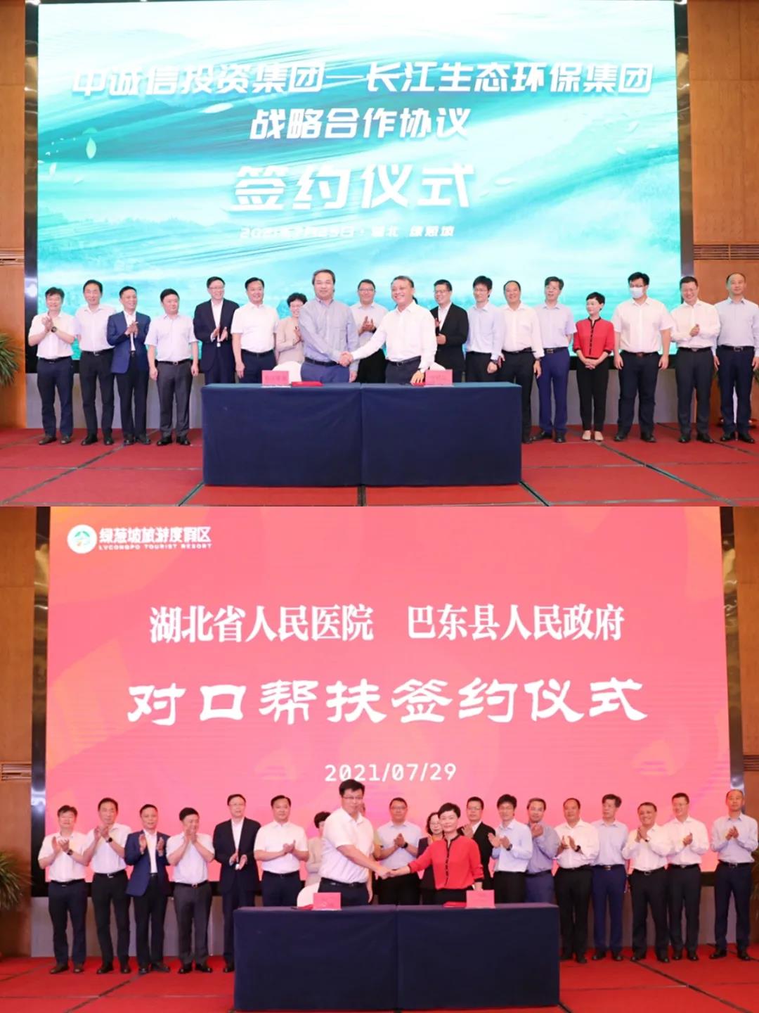 隨后的簽約儀式上,中誠(chéng)信集團(tuán)董事長(zhǎng)毛振華和長(zhǎng)江生態(tài)環(huán)保集團(tuán)董事長(zhǎng)趙峰代表雙方公司共同簽署了戰(zhàn)略合作協(xié)議;湖北省人民醫(yī)院(武漢大學(xué)人民醫(yī)院)黨委副書記余鋰鐳與巴東縣人民政府副縣長(zhǎng)黃艷妮共同簽署了湖北省人民醫(yī)院對(duì)口幫扶巴東縣綠蔥坡鎮(zhèn)衛(wèi)生院協(xié)議。